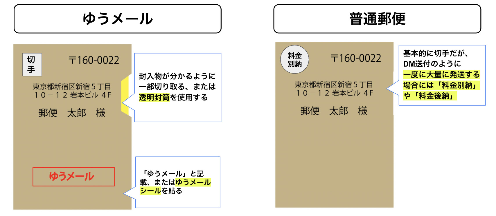 ゆうメールは普通郵便に比べ安価に発送できますが、送れるものが限られます。一方、普通郵便は送れるものに制限はありませんが、ゆうメールに比べ料金が割高となります。